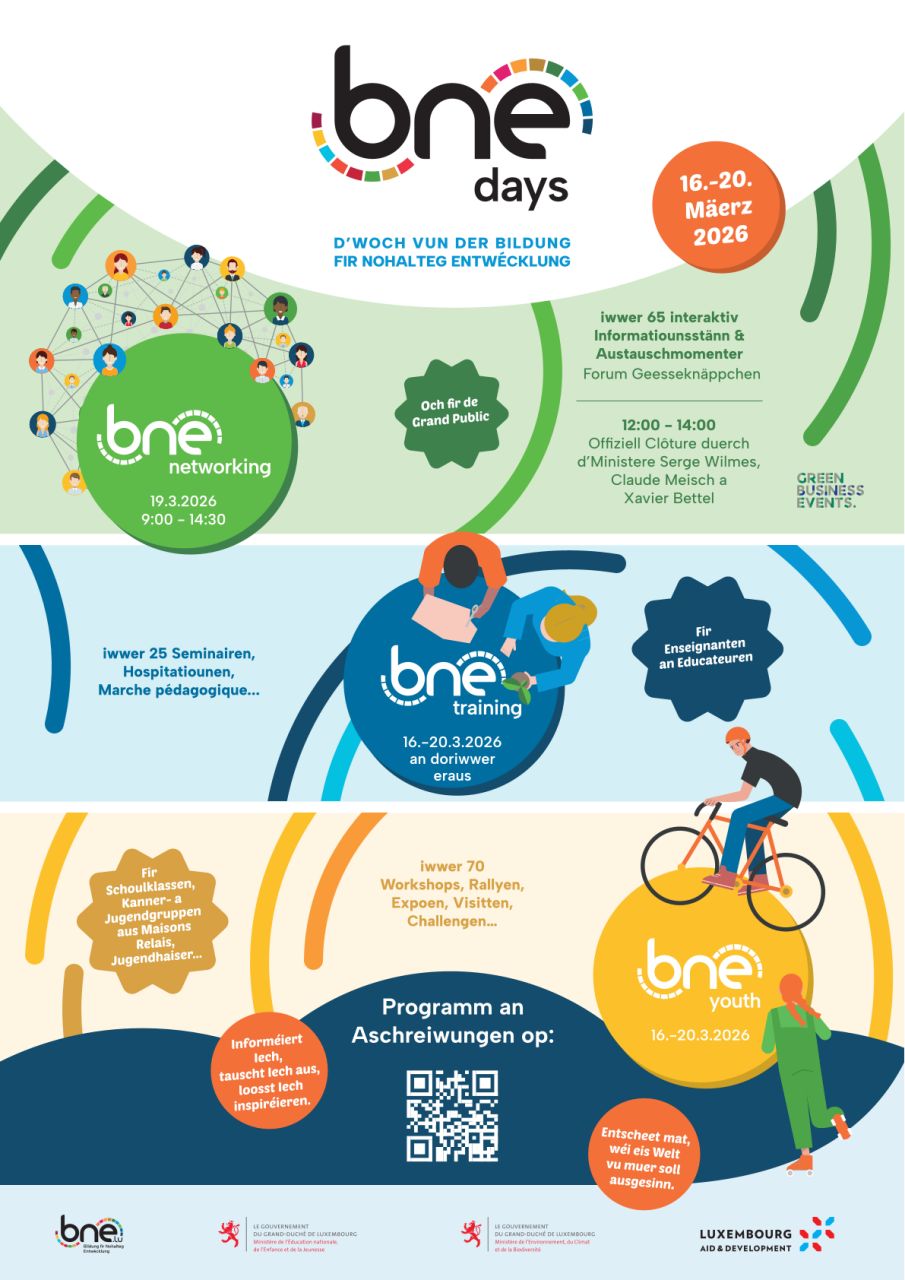 - BNE Networking (ancienne Foire BNE) : Une journée d’échanges hors du commun vous est garantie le 19 mars 2026 de 9h à 14h30 au Forum Geesseknäppchen. Vous aurez l’occasion de visiter plus de 65 stands d’exposition interactifs et de vous inspirer des offres pédagogiques d’ONG, d’administrations et de structures éducatives. Le BNE Networking est accessible au grand pubic, et sans réservation.