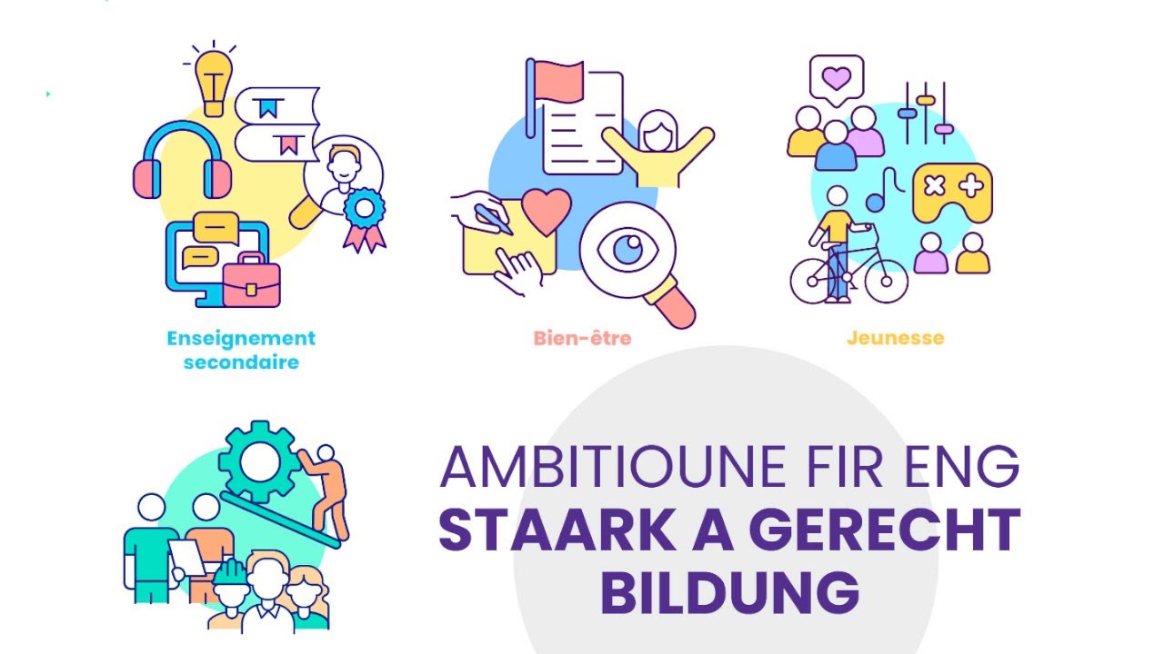 D’Bildung ass a bleift eng zentral Erausfuerderung, op där d’Zukunft vun eise Kanner an eiser Gesellschaft opbaut. Dofir wäert d’Bildungspolitik och weiderhin d’Ambitioun hunn, all Acteuren zesummenzebréngen, fir gemeinsam dofir ze suergen, datt all Kand, all Jugendlechen an all Erwuessenen déi bescht Chancë kritt, fir säi Parcours, seng perséinlech Entwécklung a säi Wuelbefannen ze ënnerstëtzen, mam Zil, sech erfollegräich an der Gesellschaft vun haut a vu muer ze integréieren.